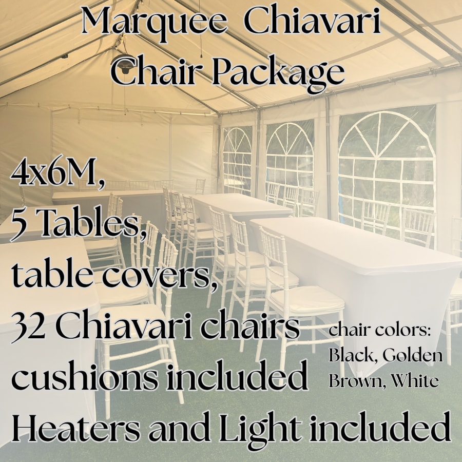This luxury marquee package includes a 4x6m marquee, 5 tables with table covers, and 32 premium Chiavari chairs with cushions, available in Black, Golden Brown, or White. The package also includes heaters and lighting, making it the perfect setup for weddings, communions, birthdays, and evening parties.