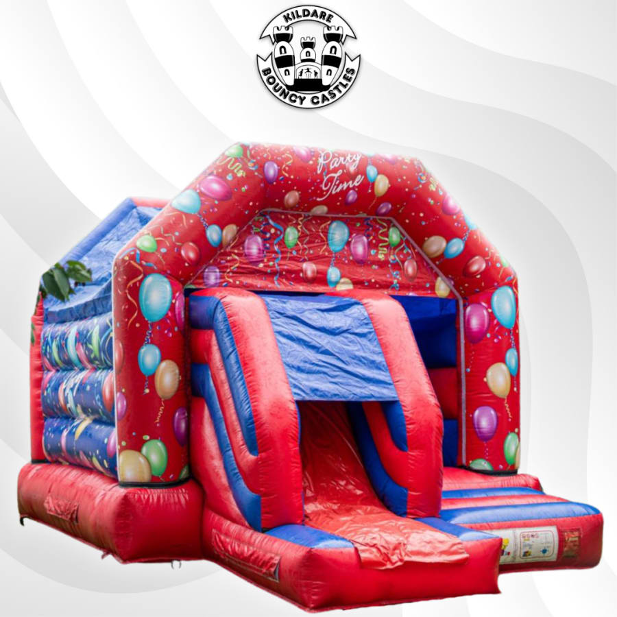 Turn up the excitement at your next party with our vibrant Red & Blue Party-Time Front Slide Bouncy Castle – 12ft x 18ft, a fantastic choice for birthdays, school fun days, and community events across Kildare and surrounding areas. This large inflatable combines a colourful party theme with a fun front-facing slide, creating the perfect setup for non-stop bouncing and sliding fun.